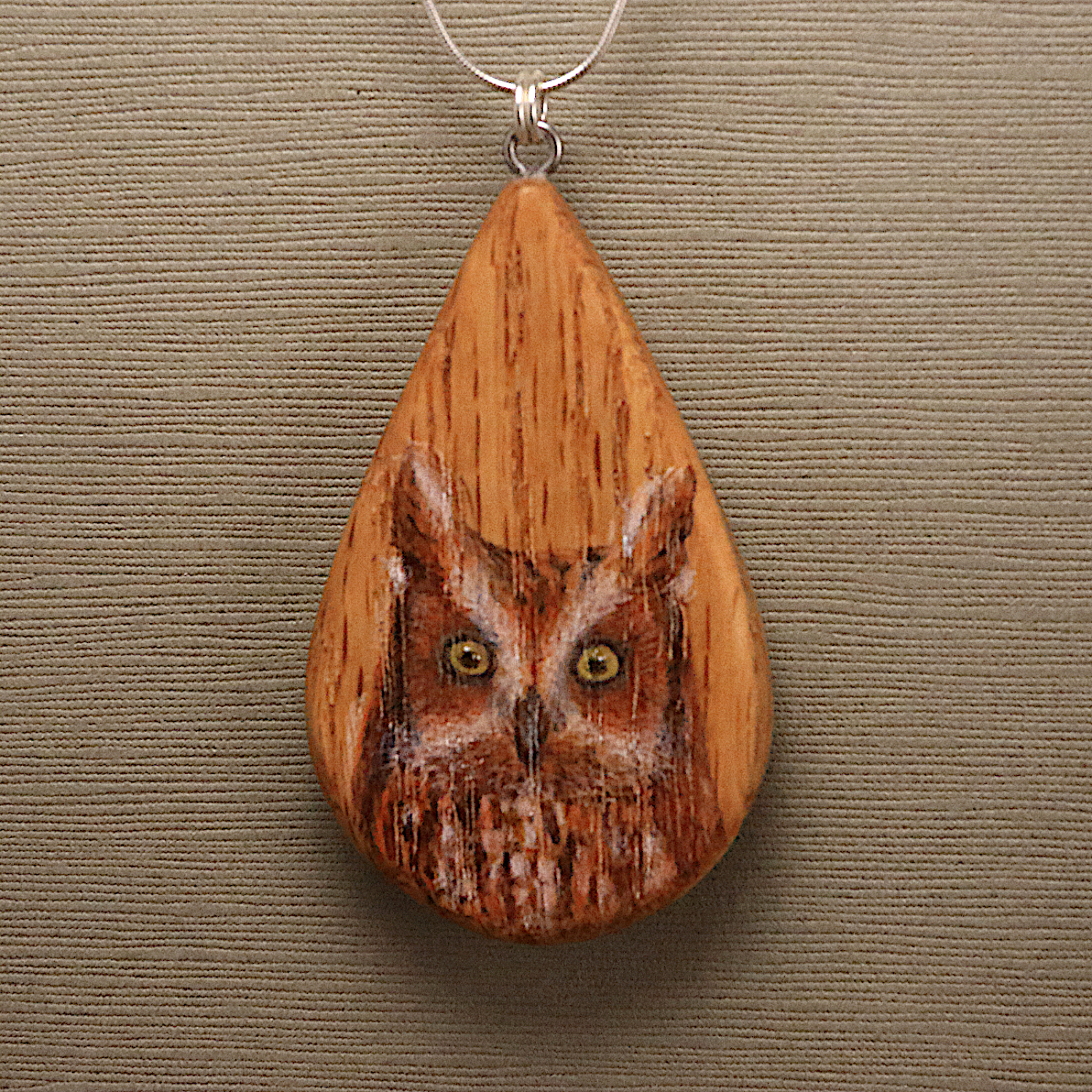 This beautiful pendant features a red morph screech owl hand drawn on Oak wood. It measures 1.5 x 2.5 inches and hangs from an 18 inch sterling silver snake chain.